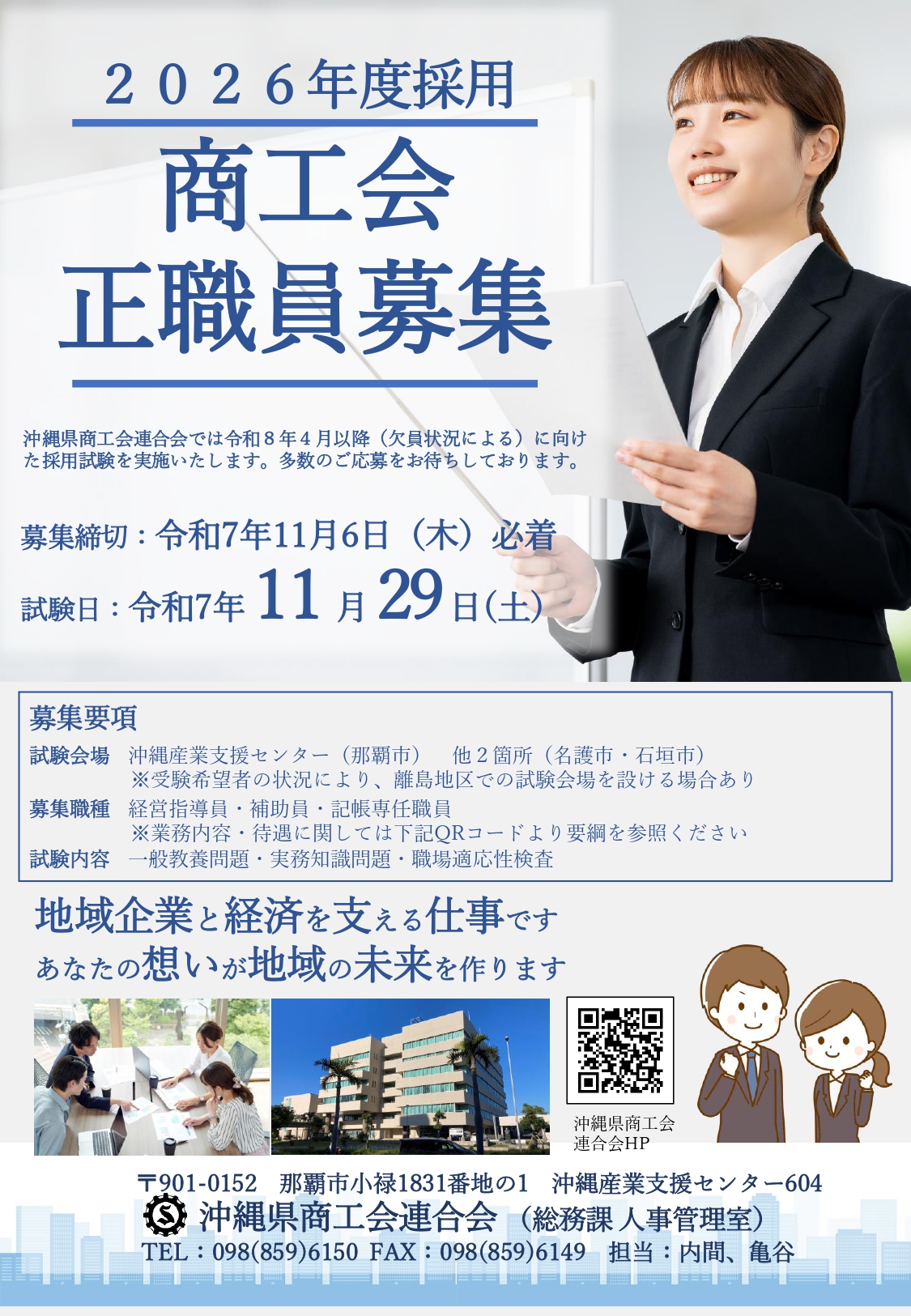 【沖縄県商工会連合会】(令和7年11月実施)令和8年4月1日以降 採用の商工会職員採用試験の実施について 県連からのお知らせ 2025年10月15日 沖縄県商工会連合会では,令和8年4月1日以降採用予定(欠員の状況に応じて採用)の経営指導員並びに庶務・経理(補助員・記帳専任職員)採用試験を次のとおり実施します。詳しくは、以下の採用情報ページよりご確認ください。 採用ページはこちらから