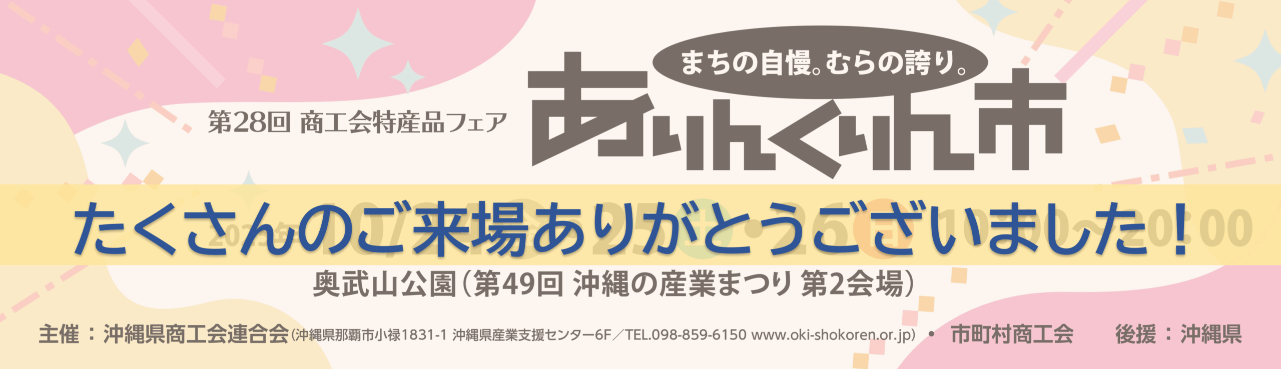- 第28回 商工会特産品フェア ありんくりん市 情報更新のお知らせ!今年は32商工会、121事業所、97ブースでの出展となります。今年も様々な事業所が奥武山公園第2会場に集結しま… 続きを読む: 第28回 商工会特産品フェア ありんくりん市 情報更新のお知らせ!